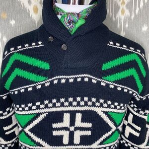 Polo Ralph Lauren Merino Wool Black & Green Multi Geometric Shawl Collar Sweater