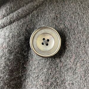 Traditional pea coat details, broad spread collar, double breasted silhouette, eight black horn button close, adjustable button tab cuffs, two besom waist pockets, two hip flap pockets, unlined.