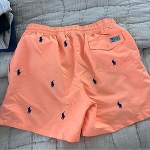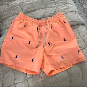 Stylish orange swim shorts with embroidered navy logos. Perfect for beach days.