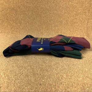 Polo Ralph Lauren Socks 3 Pairs Crew Cotton Argyle Stripe Solid Burgundy Navy