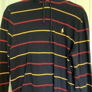 Stylish Polo Ralph Lauren hoodie. Featuring a classic navy base adorned with striking red and yellow stripes, this piece combines comfort and fashion effortlessly. The soft fabric offers a cozy feel, while the hood adds versatility for cooler days. Ideal for layering or wearing solo, this long-sleeve hoodie is perfect for everyday wear.