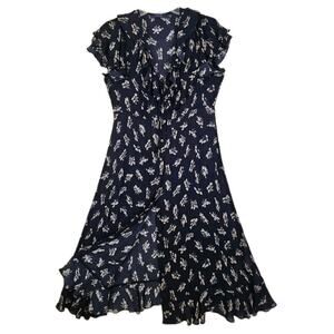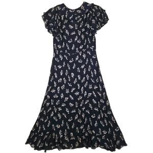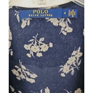 This Polo Ralph Lauren navy and beige floral ruffle sleeve summer dress in size 4 features a round neck with a button closure. Made of lightweight chiffon fabric, the knee-length dress is perfect for occasions like parties, casual wear, and Holy Communion. The ruffle accent, empire waist, and high waist give the dress a stylish and elegant look, ideal for summer, fall, and spring seasons. With its classic preppy design and designer brand, this dress is a versatile and fashionable choice for any woman's wardrobe.