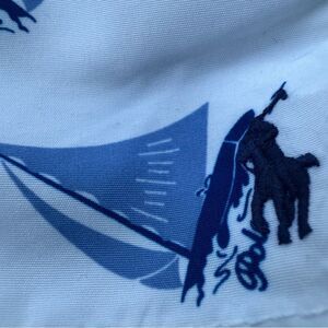 Dress your little one in classic summer charm with these brand new Polo Ralph Lauren swim trunks, featuring a vibrant allover sailboat and seagull print in shades of blue over crisp white. Made from recycled polyester, they include a comfortable mesh lining, side pockets, back flap pocket with button, and a signature Polo Ralph Lauren logo embroidered on the leg.