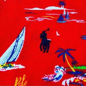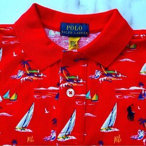 This bright red polo shirt from POLO RALPH LAUREN features a fun nautical print with sailboats, waves, and palm trees. Made of 100% breathable cotton, it’s perfect for beach days or sunny adventures. Includes a classic collar, button placket, and the iconic pony logo embroidery.