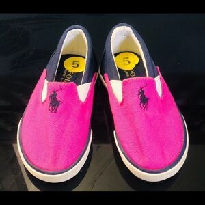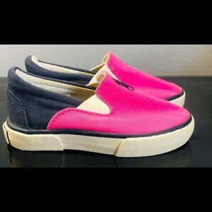 Polo Ralph Lauren Canvas Sneaker Shoes Blue/Pink Slip On Toddler Girl’s Size 5 Medium. Canvas Insole Rubber Outsole. Excellent Preowned Condition!