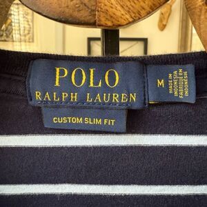 Polo by Ralph Lauren dark blue 100% cotton custom slim fit short sleeve T-shirt with light blue stripe and dark blue embroidered polo pony at the chest. Laying flat measures 26 inches shoulder to hem and 18 inches armpit to armpit.
