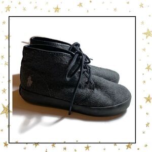 Nice pair of Polo Ralph Lauren boy's slate gray, fabric, tie sneakers.