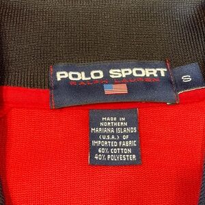 Red jacket has double striped down both arms. Two outer pockets. Fabric is in pristine condition, with no flaws detected. Small size is slightly larger than most small sizes I've encountered, wears like a medium. Used. Key search words: sweatsuit, Ralph Lauren, sweatshirt, jogging suit jacket, gym wear.