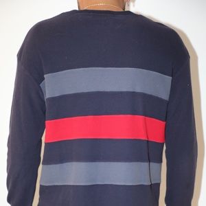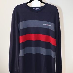 Striped Polo Sport sweater. Easy/laidback fit. Fits like a Medium, or even a Large.