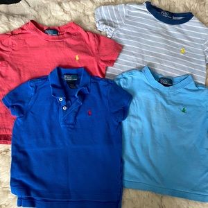Set of four T-Shirts in used condition with minor stains. Great for a toddler in action.