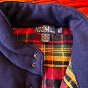 This navy blue polo vest with tartan lining is beautiful. Ina brushed fabric that is cozy to wear and soft to the feel it is padded and comes with original snaps. It is a size XL