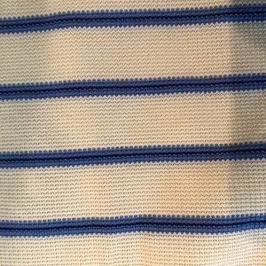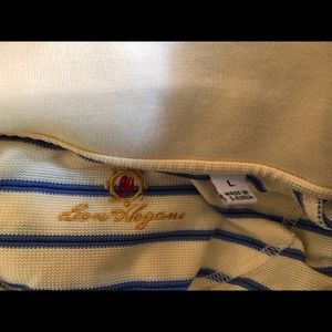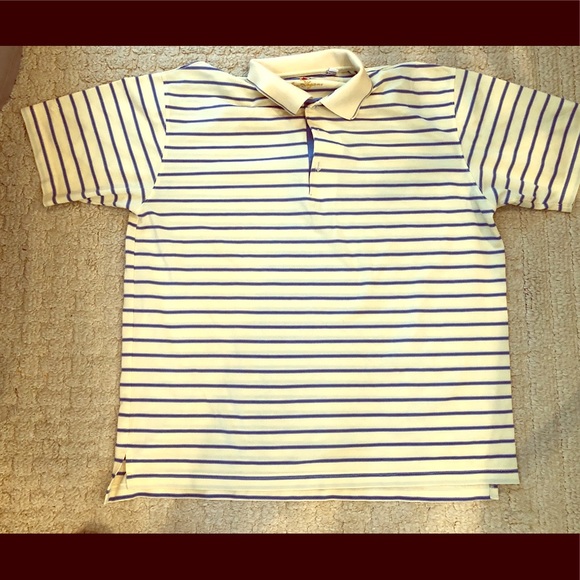 This is a great yellow with blue lines knit polo short sleeve shirt. Fits true to size