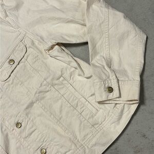 Elegant light tan jacket with button closure. Features chest pockets and classic collar. Ideal for layering.