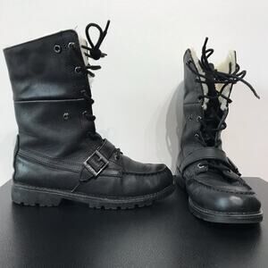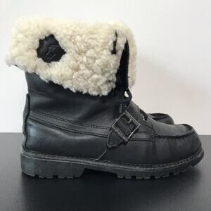 Polo by Ralph Lauren Black Leather, Ranger Ultra Hi. Shearling Lace Up Fold Over Buckle Strap Moccasin Toe Outdoor Winter Boots