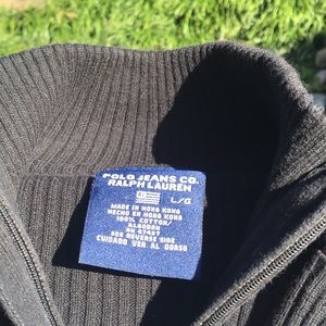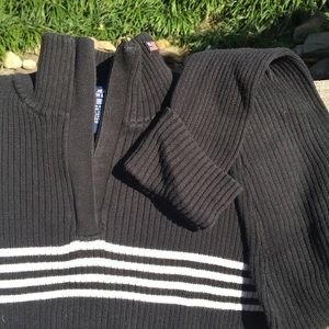 Stylish black sweater with white stripes. Quarter zip neck design with American flag embroidery. Perfect for layering.