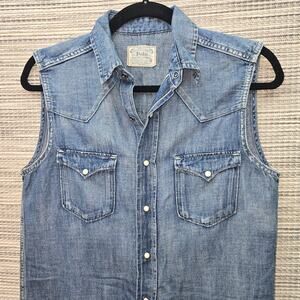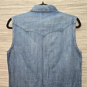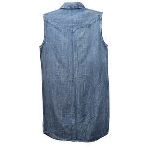 Sleeveless denim mini dress. Button-down front. Classic collar. Dual chest pockets.