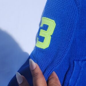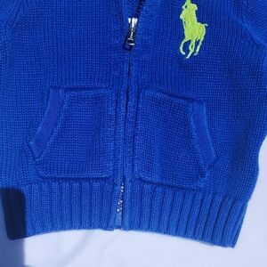 This vibrant blue hoodie from Polo by Ralph Lauren features a full front zipper and a hood, accented with a large green Polo horse logo on the chest. Its ribbed knit construction and athletic style offer both comfort and a classic look.