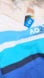 Stylish sweater with blue and white stripes. Features a hood and drawstrings. Comfortable and trendy.