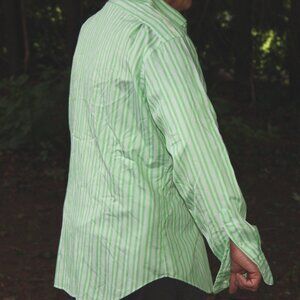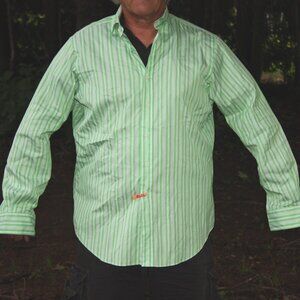 This is a Polo by Ralph Lauren dress shirt. This has been worn and still has a dry cleaning tag on it. It's marked 16 1/2 L and measures about 35" long and 27" pit to pit. The sleeve is 28". There are some wrinkles from poor storage and a slight smell, it is fresh from an estate.