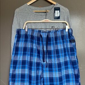 Soft gray top with Polo logo. Blue plaid pajama pants for a cozy fit. Ideal for bedtime comfort.