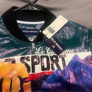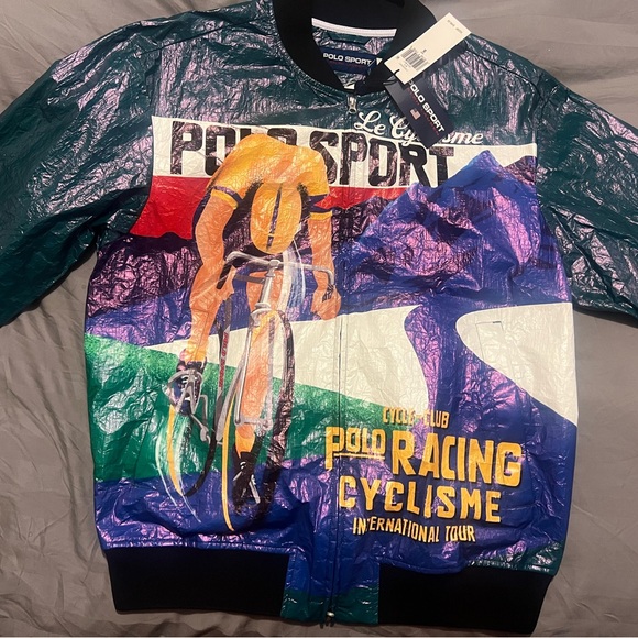 Vibrant jacket with dynamic cycling design. Features bold colors and Polo Sport branding. Ideal for sports enthusiasts.