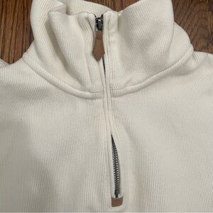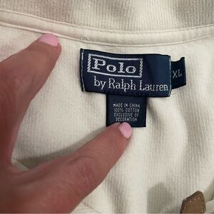 This is a cream colored 1/4 zip by Polo by Ralph Lauren. It has a dark brown embroidered logo and a brown leather zipper pull. It is a size XL. There is one very small spot on the bottom of the shirt, it is so faint I could barely get it to show in the photo.