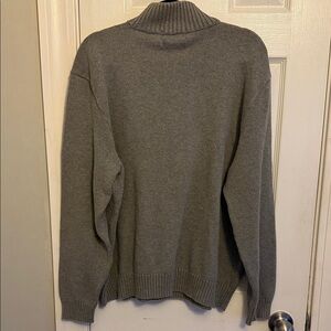 Stylish gray zip-up sweater. Features ribbed collar and cuffs. Signature logo on chest. Missing the zipper tab as pictured. Still in great condition