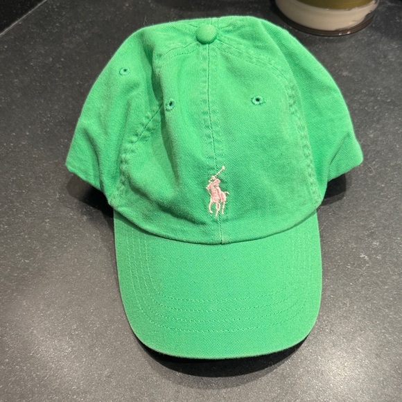 Stylish green cap. Features iconic pink Polo logo. Perfect for casual wear.