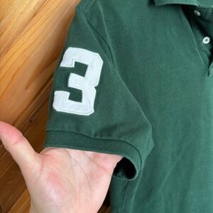 Classic Ralph Lauren polo in dark green. Features iconic logo on chest. Short sleeves with number detail.