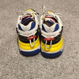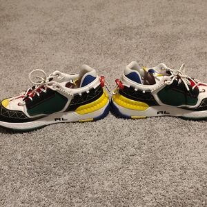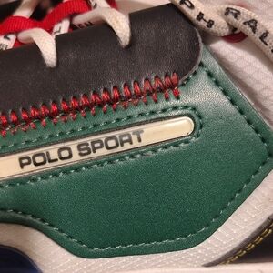 Stylish chunky sneakers with green and black leather accents. Red stitching adds a bold touch. Perfect for casual wear.