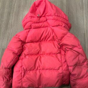 Stylish pink puffer jacket. Features a cozy hood. Perfect for keeping warm. Have some stains that can come off when washed.