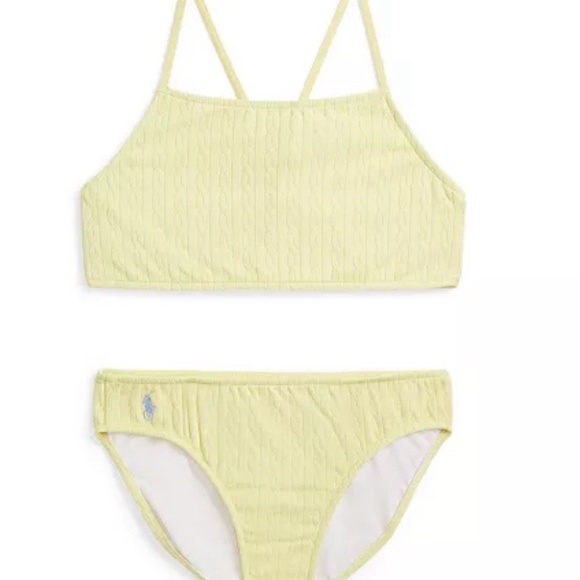 Stylish kids swim set by Polo Ralph Lauren. Features a one-shoulder top and matching bottoms. Comfortable and chic for pool days.