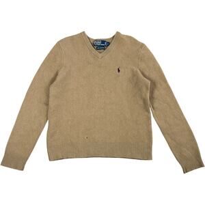 Classic camel tan 100% lambswool v-neck sweater with embroidered pony logo on chest. Soft, warm, and timeless. Small holes and minor wear throughout.