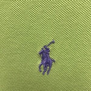 This green Ralph Lauren polo shirt is done in the mesh fabric with lavender polo pony on the left side. Excellent used condition