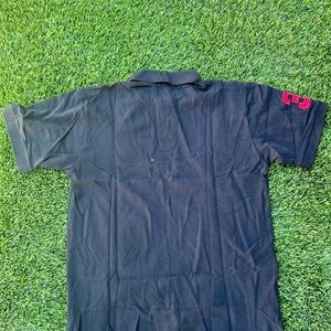 Classic black polo with striking red logo. Perfect for casual wear. Comfortable and stylish.