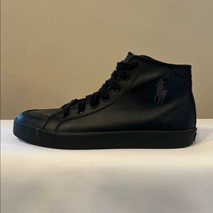 Polo by Ralph Lauren men’s black high-top sneakers featuring a the iconic Polo pony logo on the side.