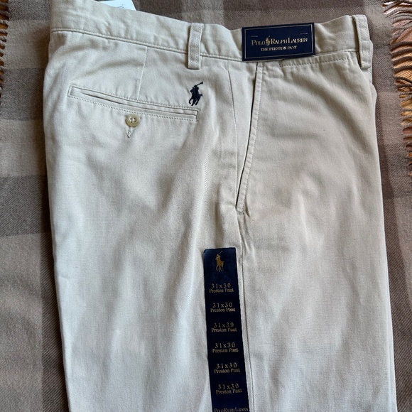 The color is a perfect khaki, tan, or light beige - an essential for any wardrobe. This pant offers a relaxed yet tailored fit, and is crafted from a durable, high-quality cotton blend. Features the iconic embroidered Polo Pony logo on the back hip. Perfect for the office, golf course, or smart casual weekend wear.