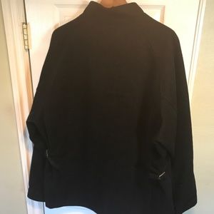 Zip up with 2 buttons at the top collar. 2 small buckles on either side, about waist height.