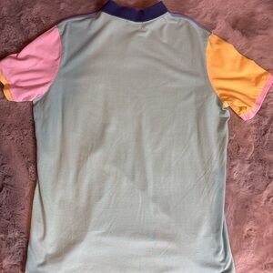 Vibrant mens shirt by Polo Ralph Lauren. Features a mix of blue, yellow, pink, and green. Iconic logo on chest.