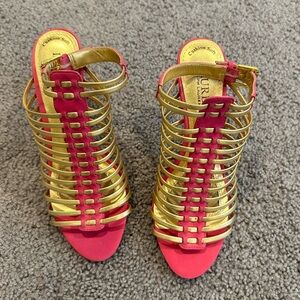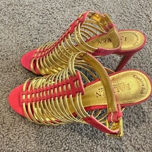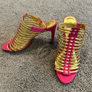 Step into elegance with these Polo by Ralph Lauren heels, showcasing a captivating blend of metallic gold straps and vibrant pink accents. The cage-like design and stiletto silhouette offer a striking, statement-making look. With an open toe and backless mule style, these heels are perfect for any glamorous occasion.