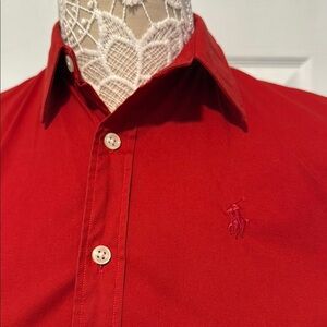 Stylish red button down by Polo Ralph Lauren. Ideal for casual outings. Comfortable and chic.