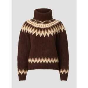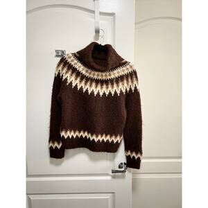 Brown abstract knit (85% Alpaca Wool, 15% Polyamide). Sweater. Long sleeves. Turtleneck. Pull on. 23.5" from shoulder to hemline.