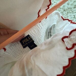 Charming white romper with red scalloped edges. Ideal for a stylish and playful outfit.
