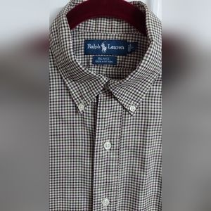 Polo Ralph Lauren long-sleeve oxford shirt, size L, 100% cotton, beige with olive, black, red and yellow check pattern. Excellent used condition.