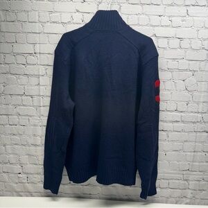 Elegant dark blue sweater with a striking red logo. Features a zip-up design and ribbed cuffs. Perfect for casual outings.