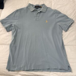 This shirt is in good condition but does have some fading that comes with wash and wear throughout. There is one spot that is noticeable on back as seen in pics. This material kinda fades like that over time but I wanted to make sure the buyer was aware. Experience timeless style with this Polo by Ralph Lauren blue polo shirt, featuring a traditional collar and ribbed sleeve cuffs. Crafted from a soft cotton blend, it offers a comfortable fit for any casual occasion.