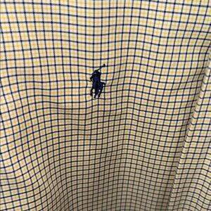 Experience the perfect blend of style and comfort with this Polo by Ralph Lauren shirt, featuring a relaxed fit and a classic button-down collar. The light tan color adds a versatile touch to your casual wardrobe. Blue&yellow stripes no rips tears holes or missing buttons