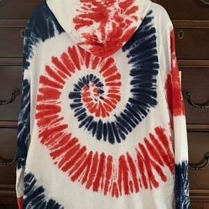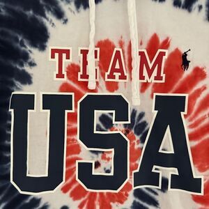 Polo Ralph Lauren 2020 Team USA Red, white, and blue tie-dye long-sleeved T-shirt with hood. Team USA screen printed on the front with embroidered navy polo logo on front left chest. Excellent condition with no rips, stains, or tears. Never worn.