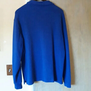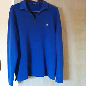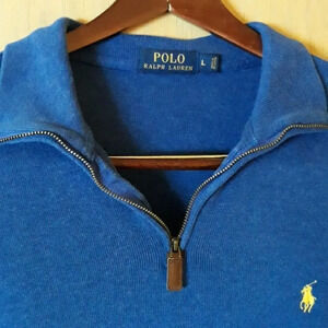 Polo Ralph Lauren blue long sleeve sweater with zippered collar. 100% cotton. Pre owned. From smoke and pet free home. Size L
