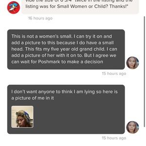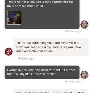 I am so hurt right now. I have never given a bad review. But this was sold to me and I was told it fits a woman’s small head. If you look at the pictures you will see it does not and it fits a toddler size head. And I was refused a refund. I have never asked for a refund I always give good reviews. I am hurt right now.